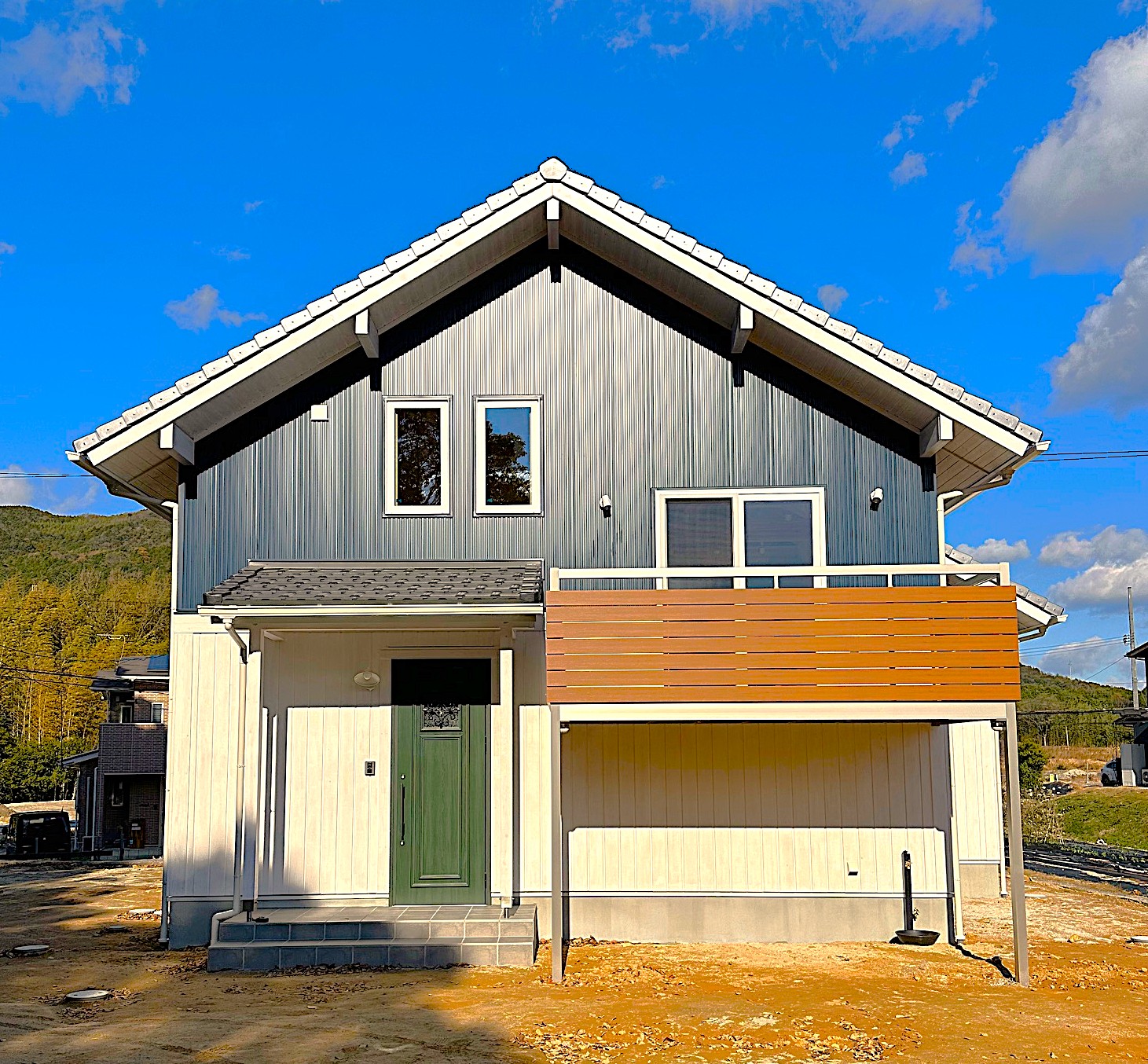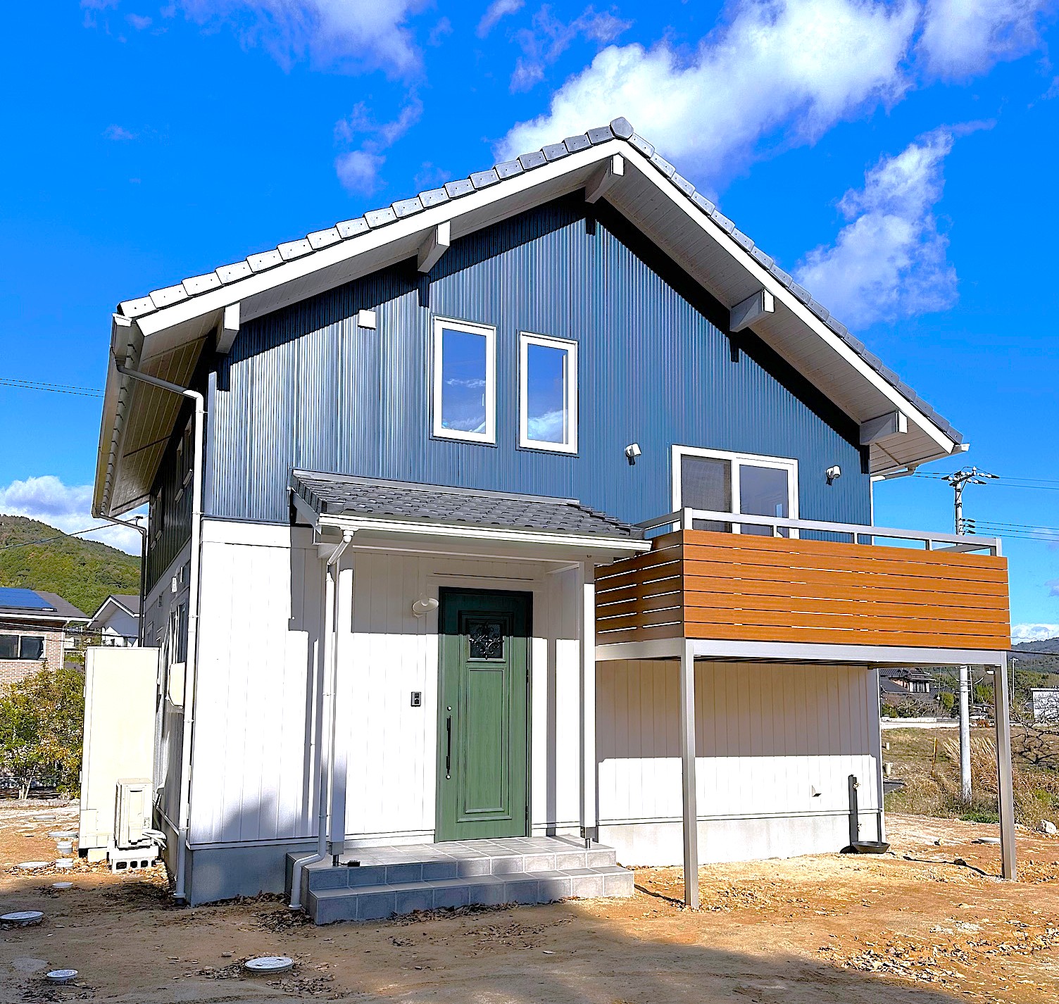 - ネイビーガルバリウム と杉板張り外壁のコントラストが抜群です。