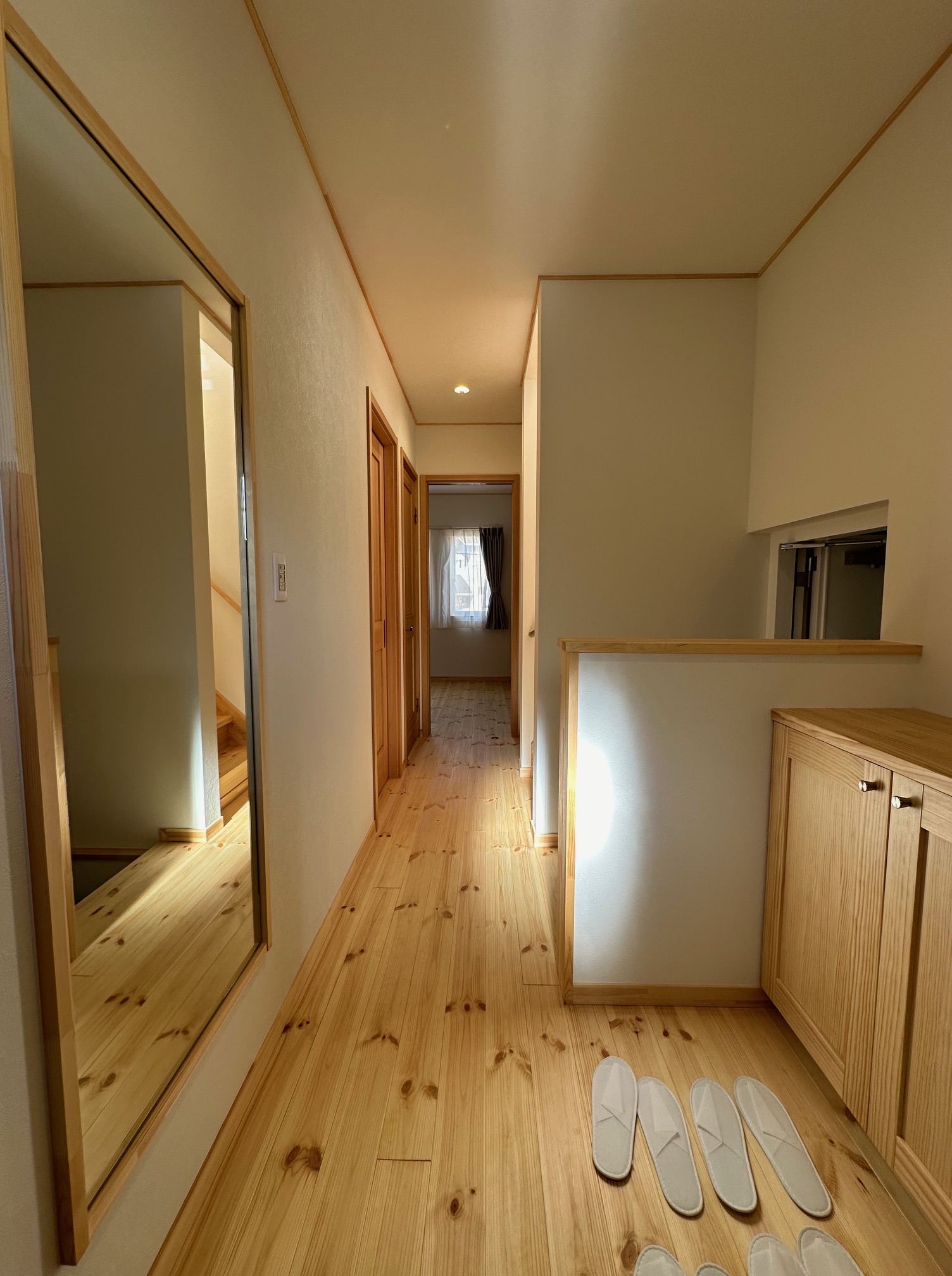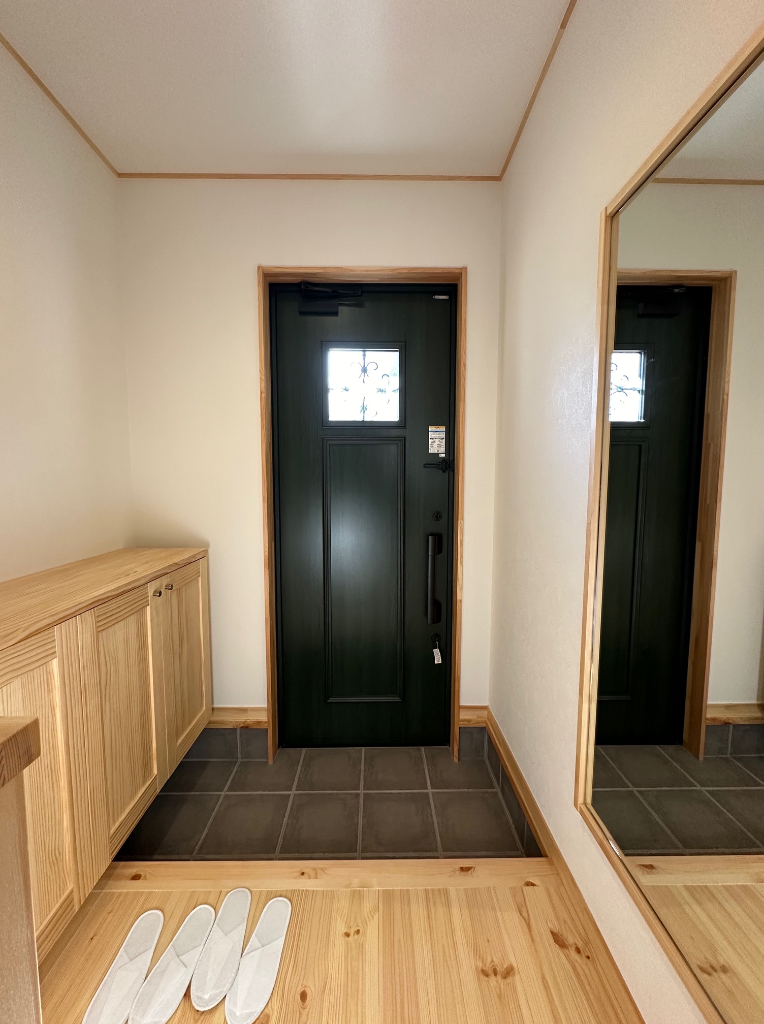 - 無垢材を使った玄関収納。玄関を開けたとたんに木の香りに包まれます。