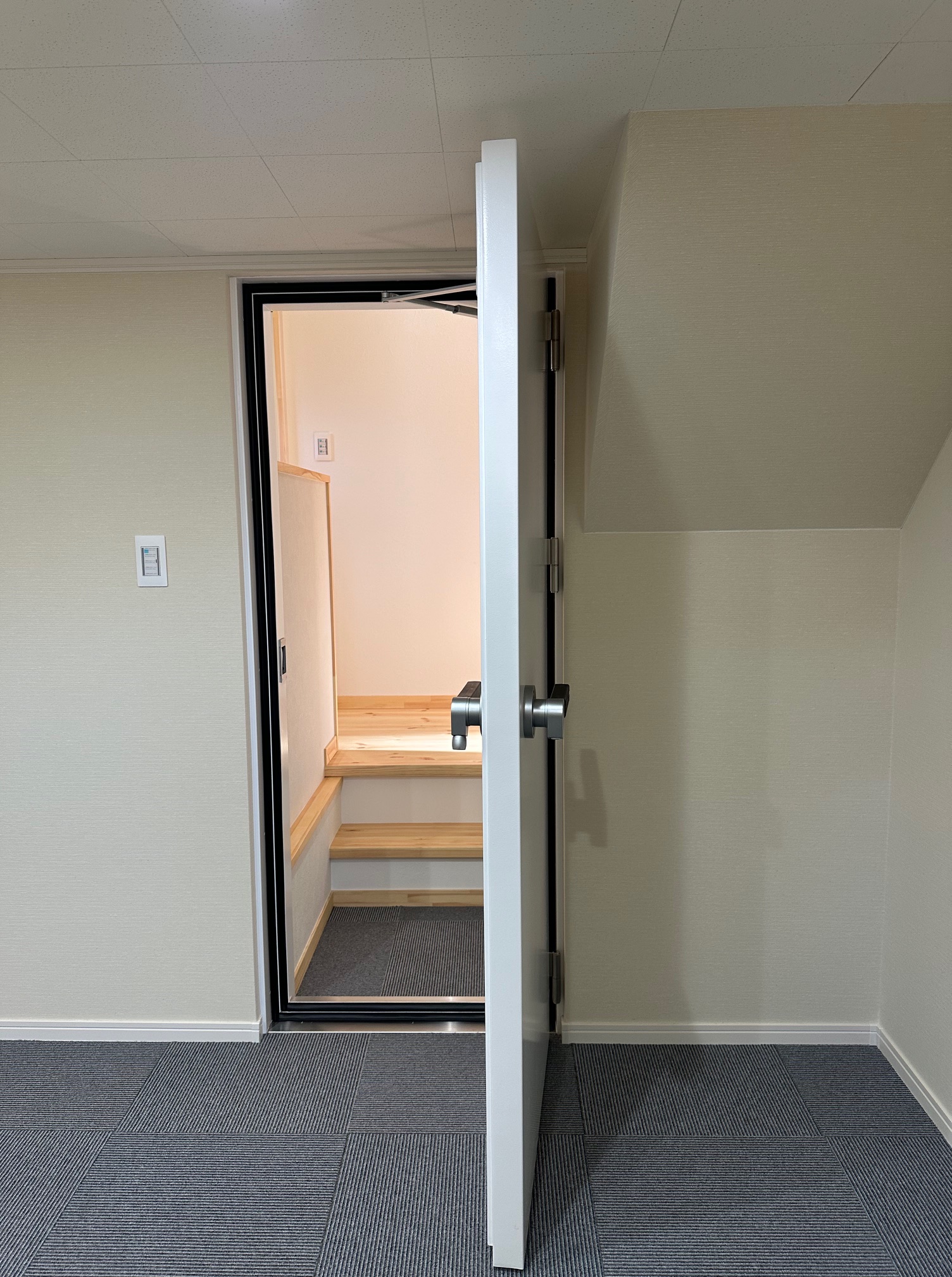 - カラオケスタジオのドアは防音仕様。まるで音楽スタジオに来たかのような重厚なドアです。