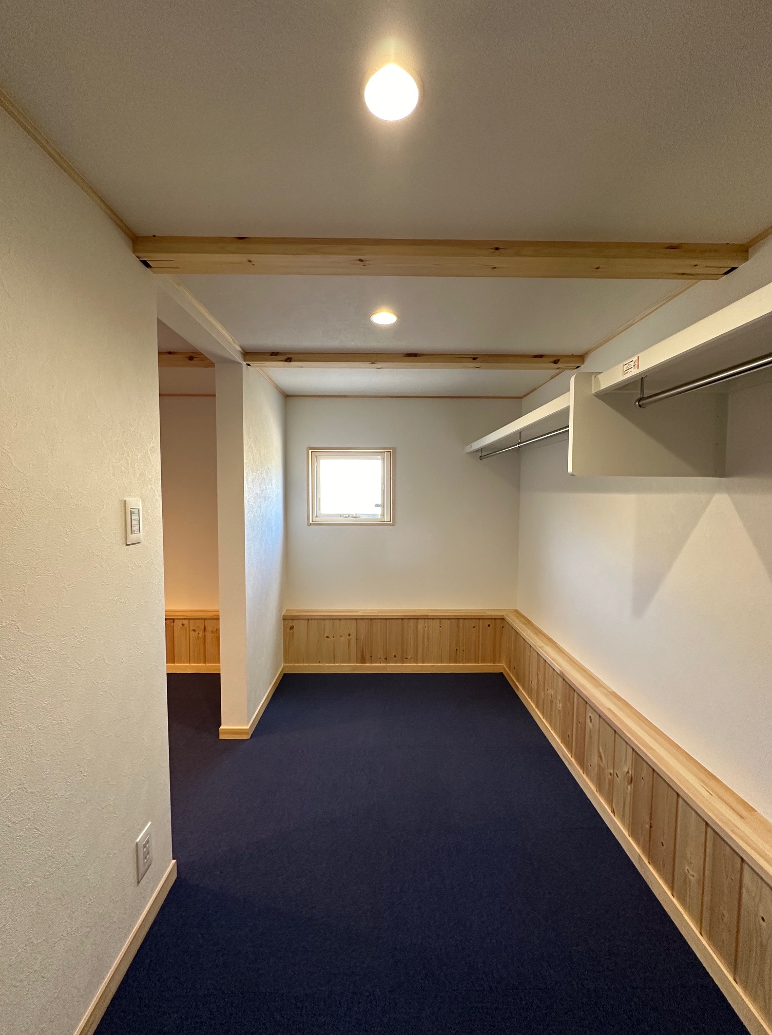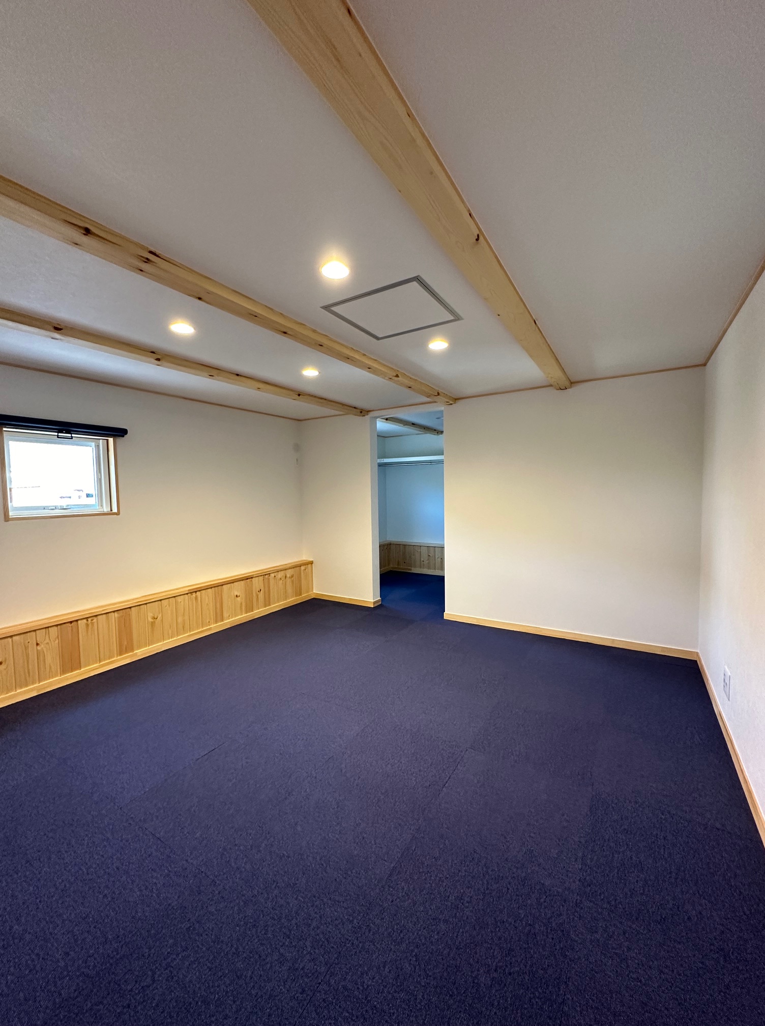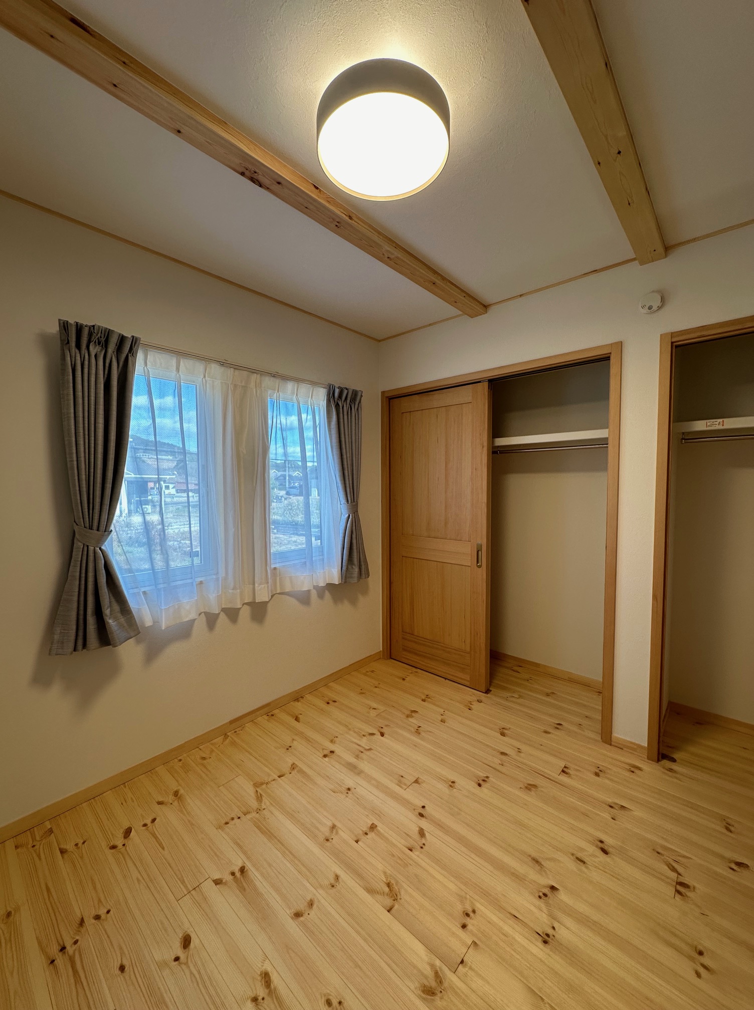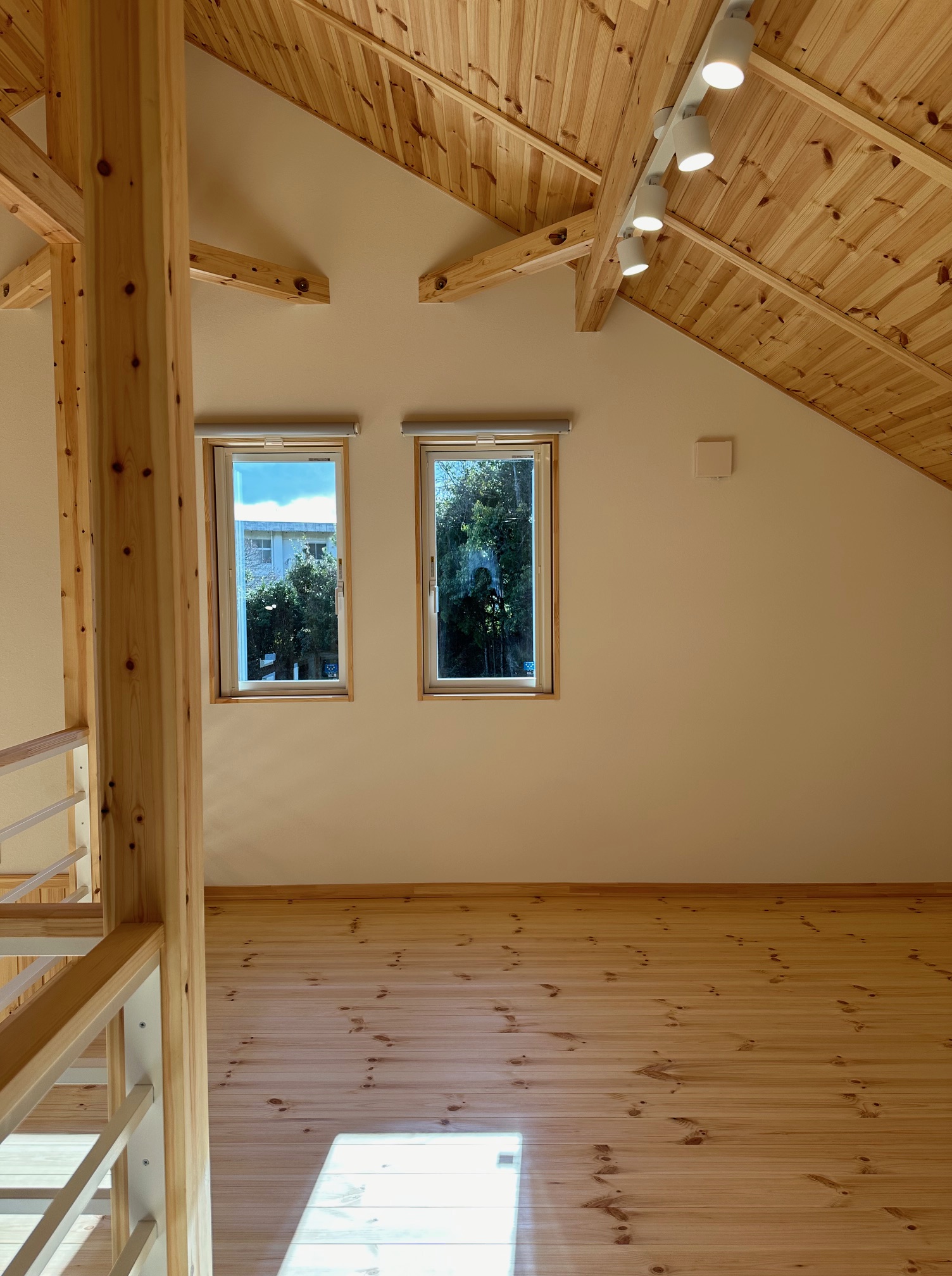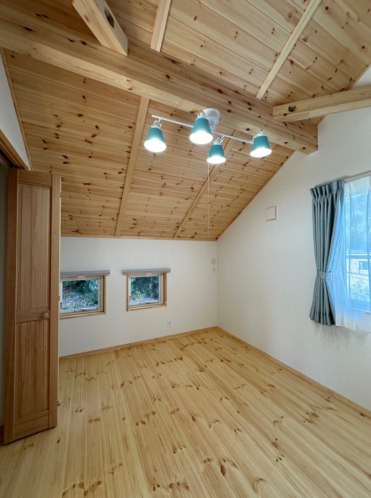 - 寝室も木の香りでいっぱい。クローゼットもプランしました。天井には梁がのぞいていてカッコいいです。