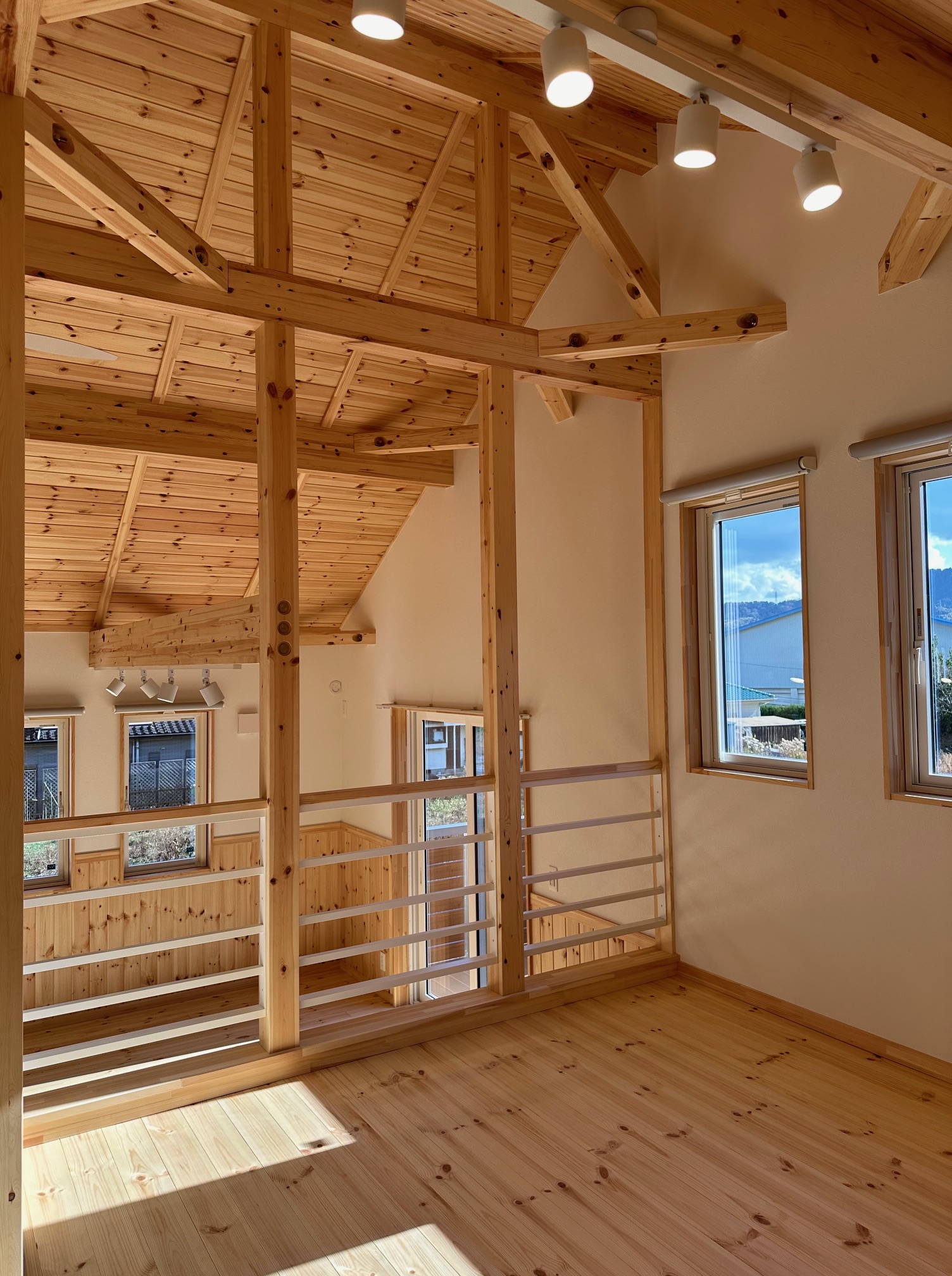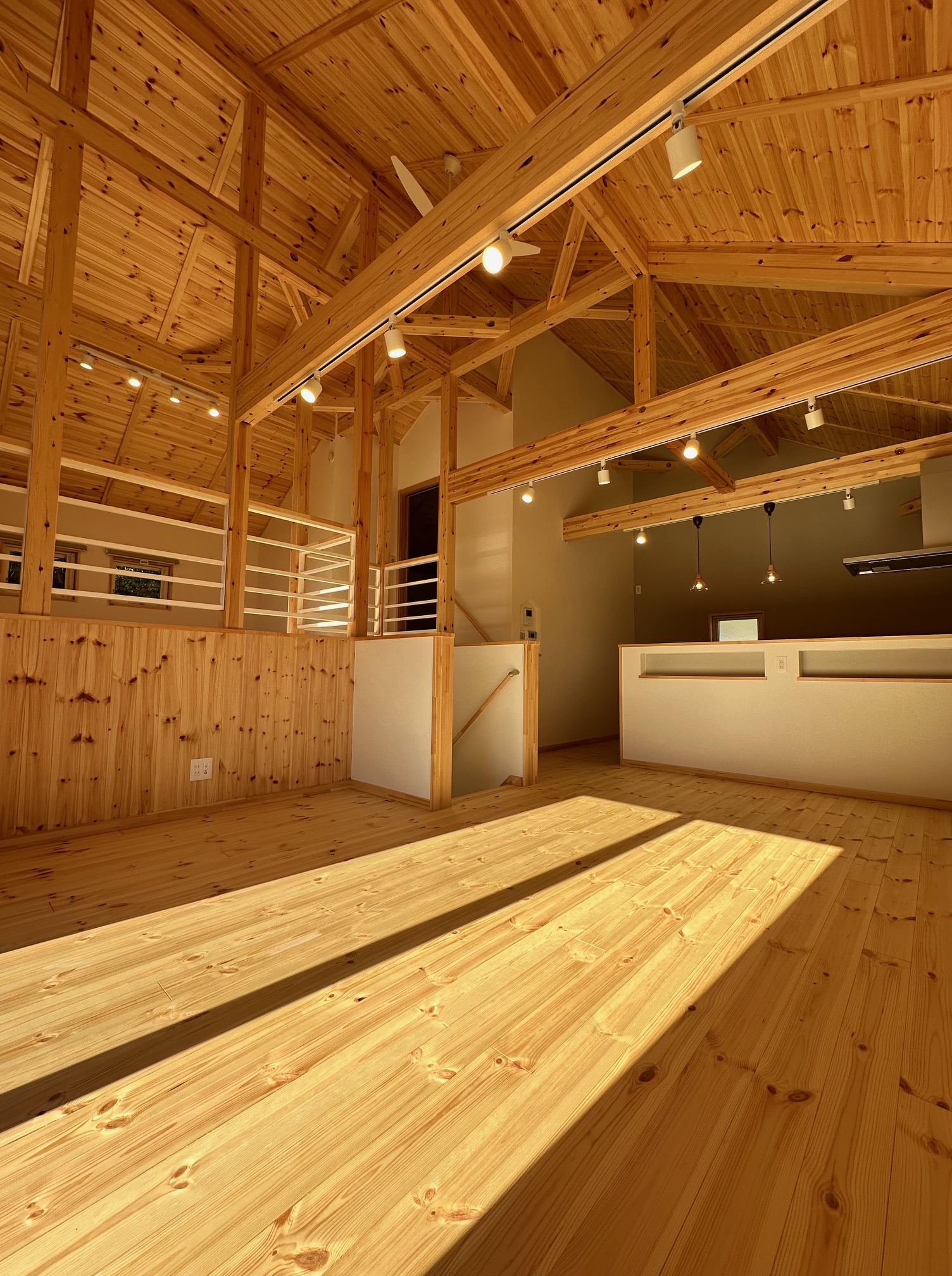 - セカンドリビングに来ました。眺めは最高。天井もないし、広々です。 山のコテージに来たみたいです。パイン材の優しい色味が心を癒してくれます。