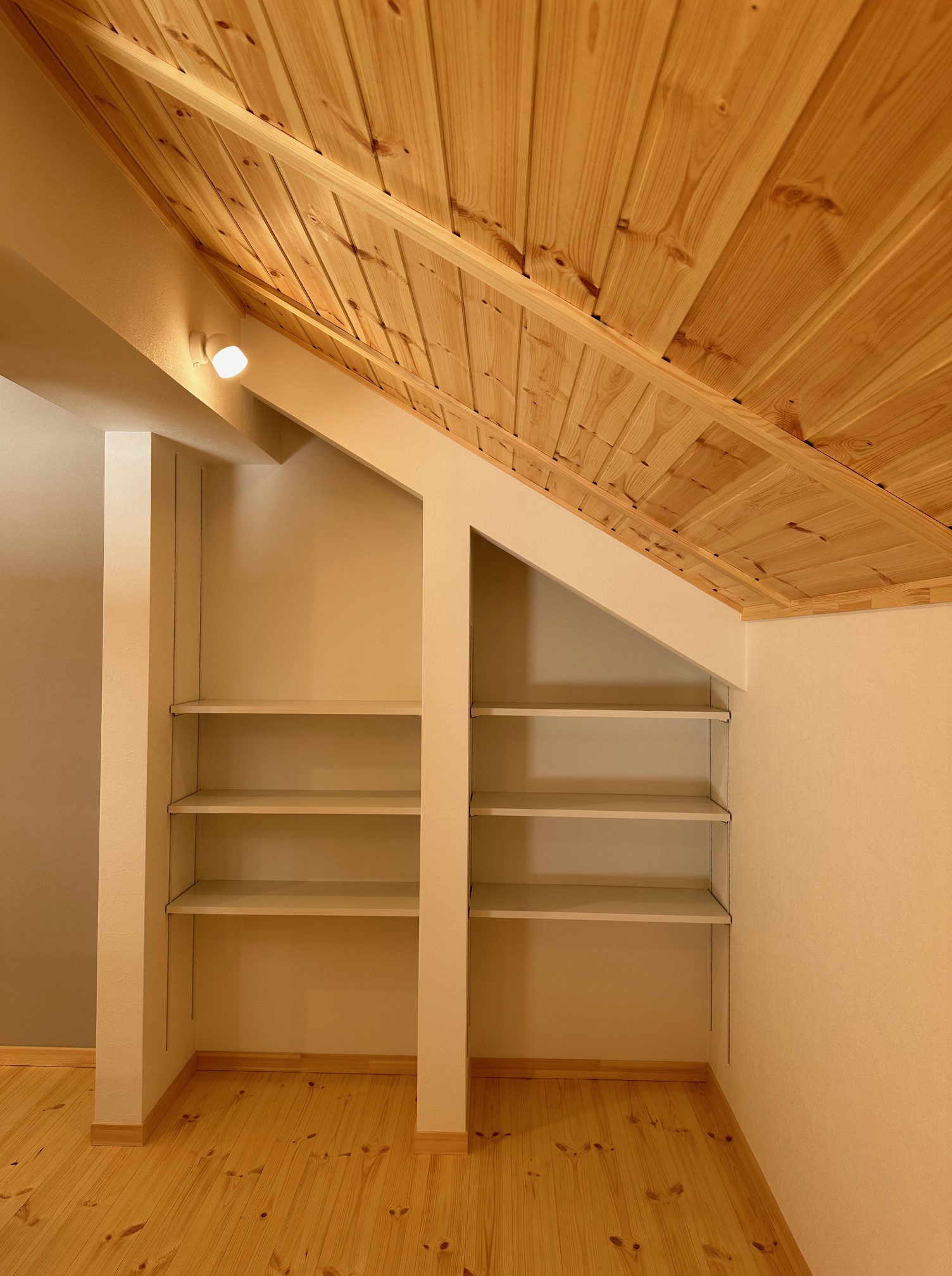 - キッチン横には勾配屋根のデッドスペースを生かしたパントリー。可動棚で様々なものを収納できます。